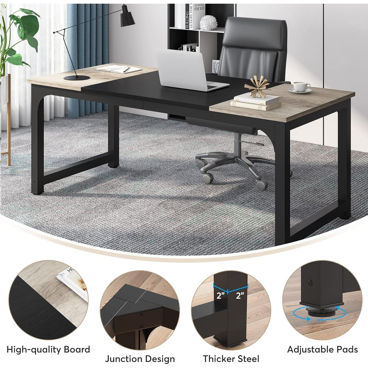 Generous Workspace and Leg Space: With dimensions of 29.52 inches in height, 70.86 inches in width, and 31.49 inches in depth, this spacious desk provides ample area for your laptop, books, office materials, and documents. The smooth surface facilitates easy cleaning and writing. The sufficient area beneath the desk accommodates a chair and mobile cabinet, allowing your legs to stretch and unwind after a long workday.