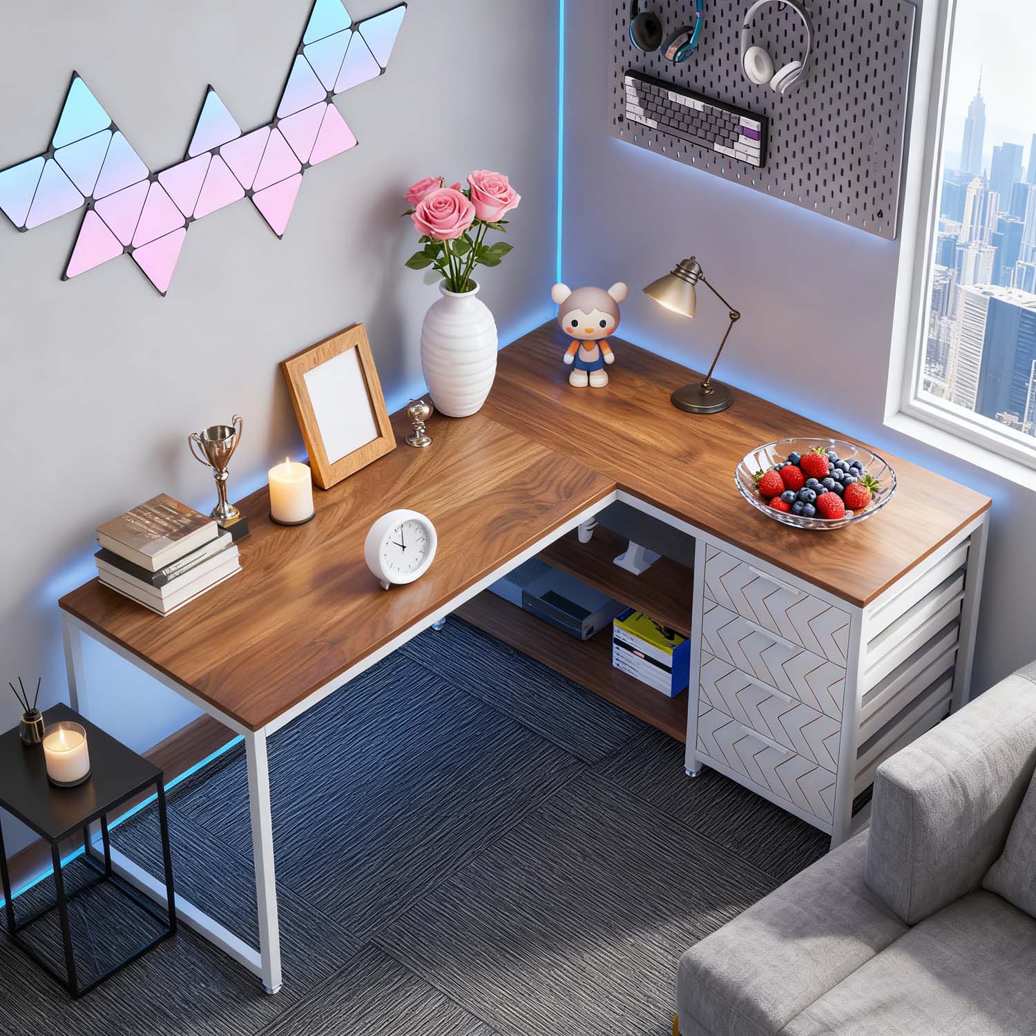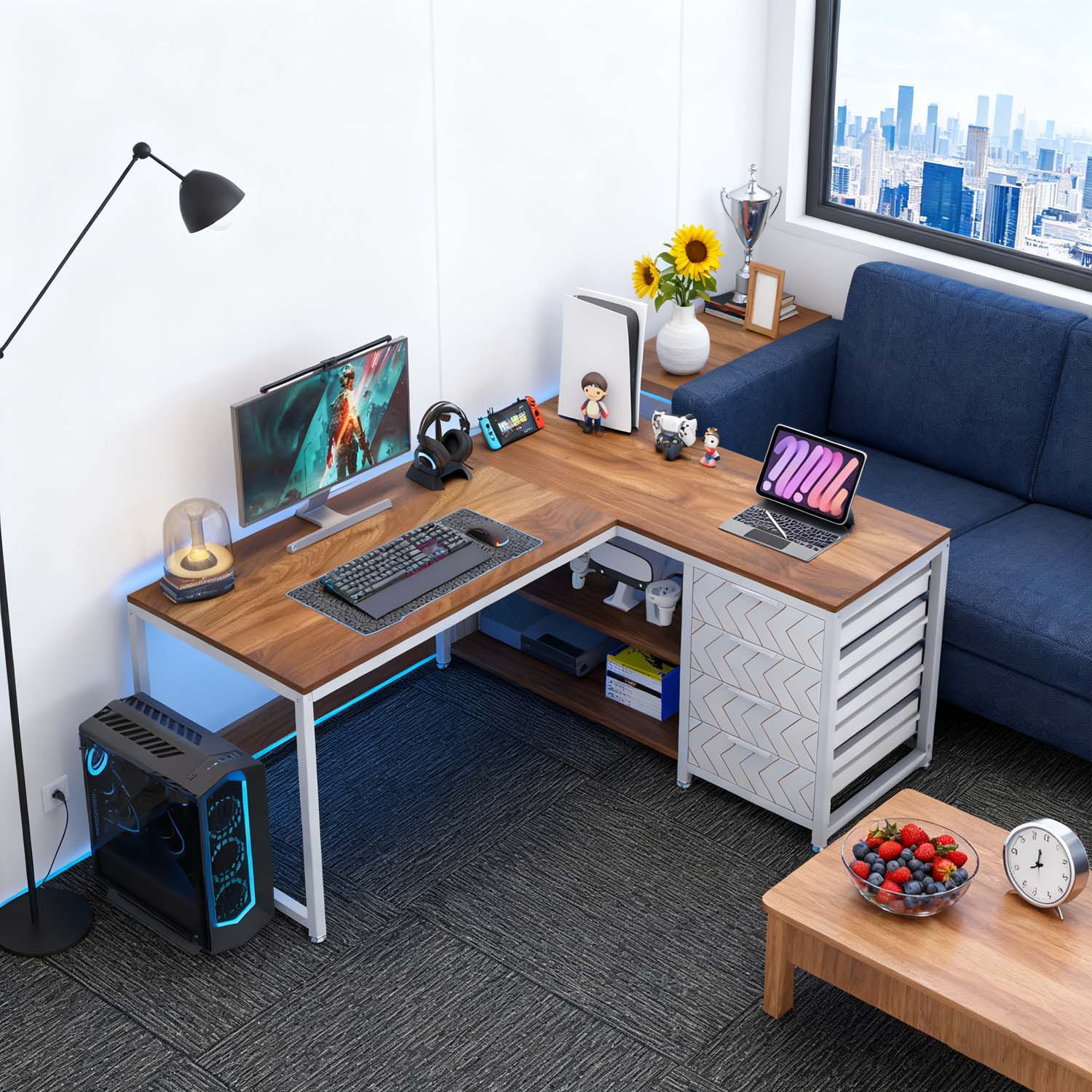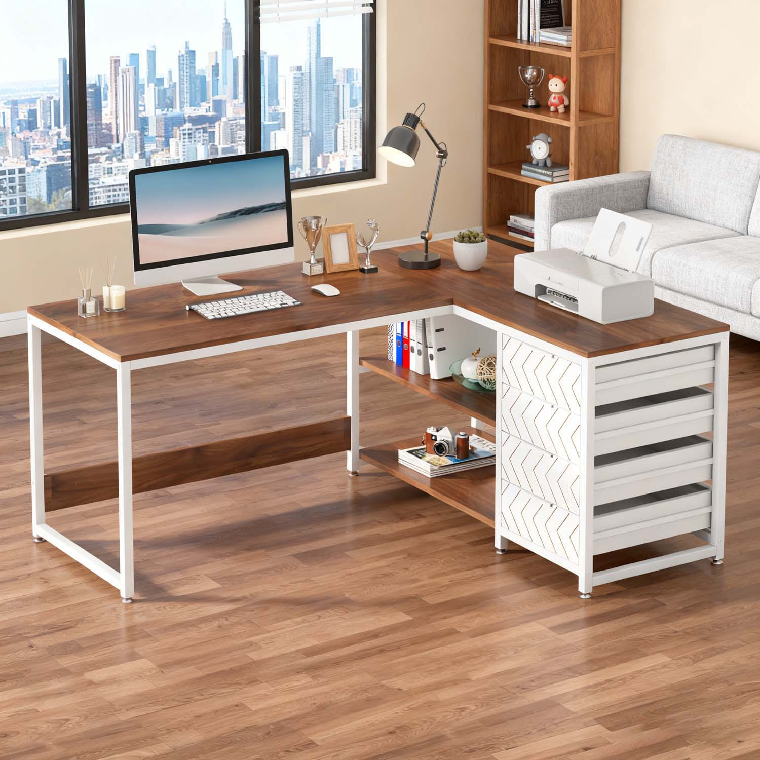 The L-shaped design is reversible: Our industrial desk features a flexible layout. You can position the storage drawers on either side based on your preferences. It merges a desk and storage solution into a single unit, making it easy to access everything.