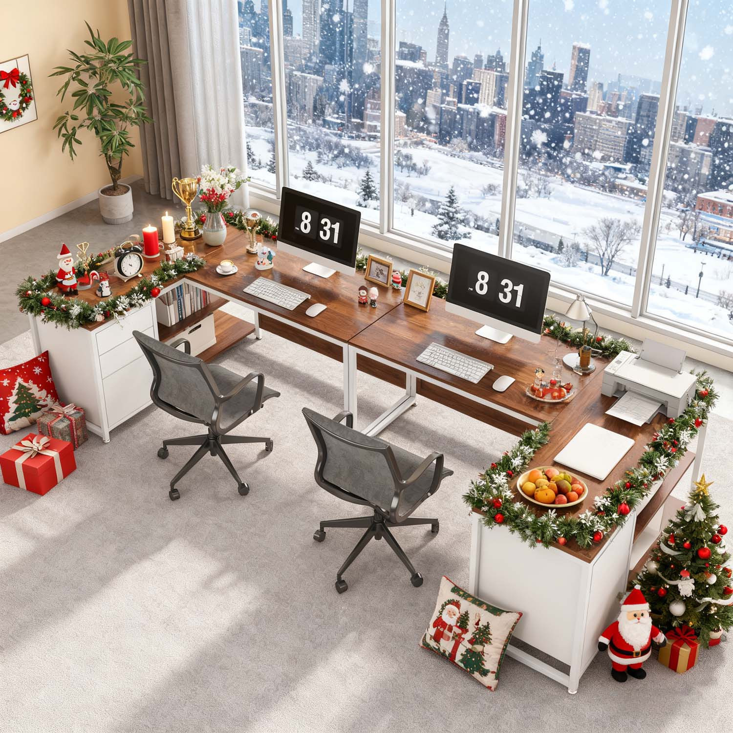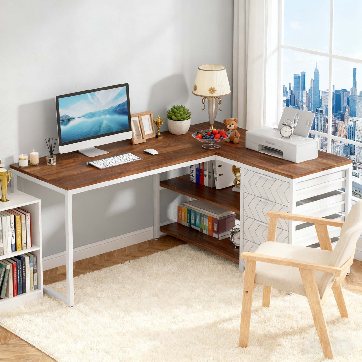 Ample Workspace: This corner desk includes two large desktops that accommodate several computers and laptops while allowing for organization. It also has a two-tier open shelf and four drawers, offering plenty of room to minimize desktop clutter. The four drawers are perfect for keeping your essential documents or personal items.
